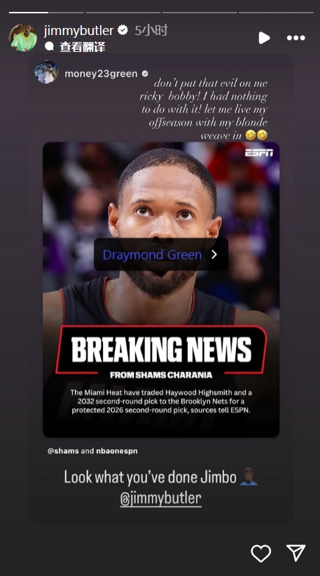 勇士队球星追梦格林在社交媒体上@吉米-巴特勒调侃道:"老兄,看看你惹出来的麻烦!"